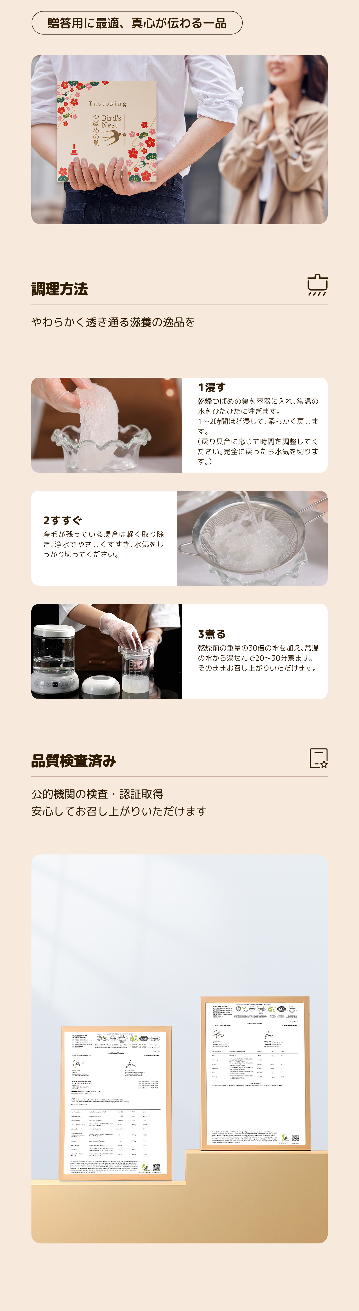 作り方:戻したつばめの巣を蒸し器に入れ、純水を加え、弱火で湯煎しながら30〜60分ほど煮る。