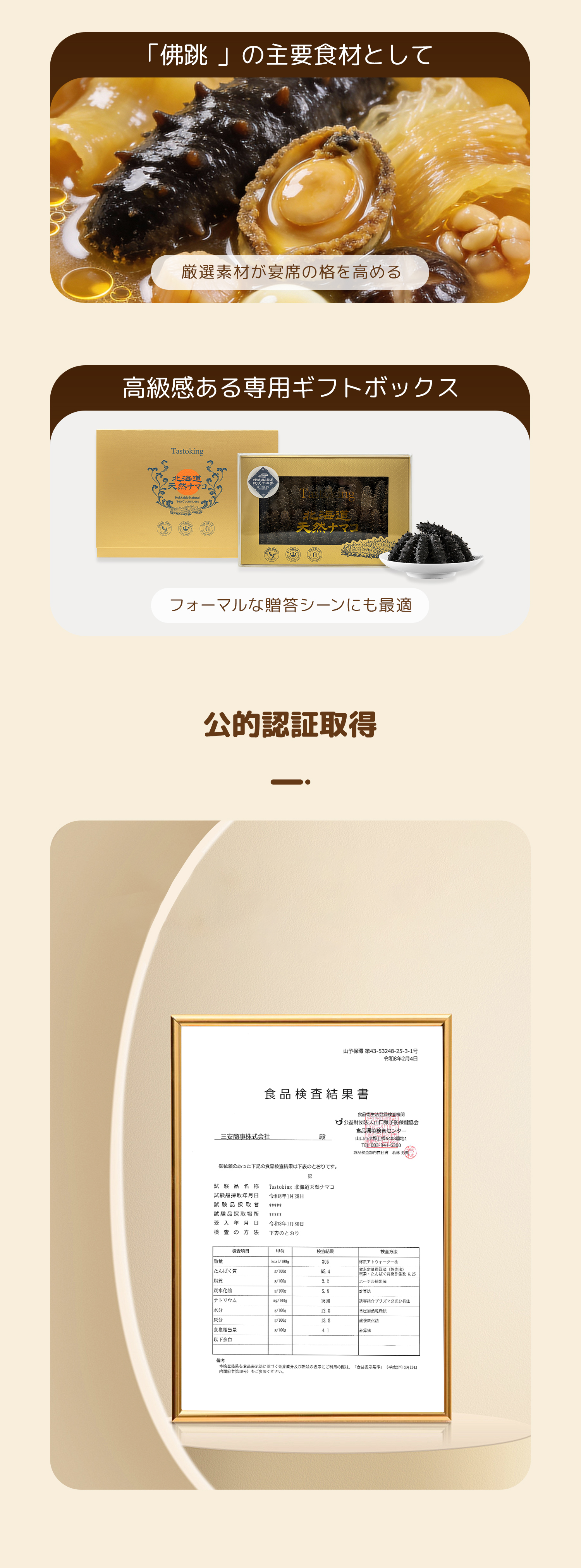 北海道天然純淡干ナマコ 純淡乾工芸 本件商品は、添加物を一切使用しない100%北海道産の純淡干ナマコとし、他産地品の混入または偽装を固く禁止する。持ち運びに便利な簡易パッケージです。